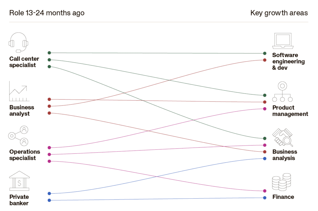 Here’s how thinking about skills-based pathways helped one financial services institution reskill hundreds of employees into critical internal roles in product, software, management, and analytics.